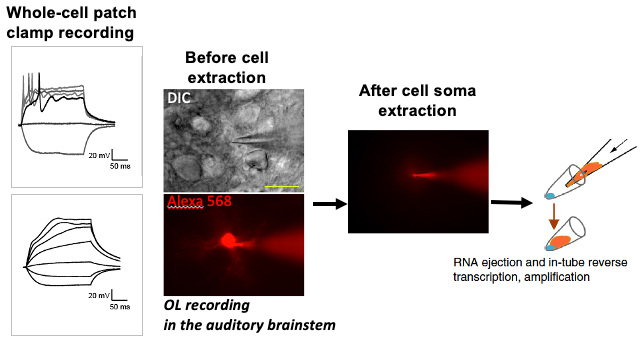 The synapse is the critical structure where neuronal information is transmitted, and presynaptic excitability is crucial for the reliable transmission of this information. However, it is very difficult to study presynaptic activity and vesicular neurotransmitter release directly at CNS nerve terminals because the sub-micron size of nerve terminals has precluded direct recordings. To study presynaptic properties directly, we take advantage of the calyx of Held, a large terminal in the central auditory system that allows direct recordings. These terminals provide a good model for synaptic transmission because they are a one-to-one synapse (i.e. one terminal to one postsynaptic neuron). Additionally, the role of synaptic transmission in auditory function and dysfunction is easily studied at this synapse. The long-term goal is to identify neurophysiological mechanisms underlying central auditory dysfunctions to improve preventive and therapeutic strategies for central auditory disorders caused by various peripheral hearing deficits (e.g. congenital deafness). Sound deprivation resulting from peripheral hearing deficits negatively impacts the central auditory circuit functions, even after peripheral sound sensitivity is restored, such as with hearing aids. Using patch-clamp recordings, advanced imaging techniques, and in vivo auditory function tests, we are studying synaptic activities and plasticity in auditory disorders during development or aging.